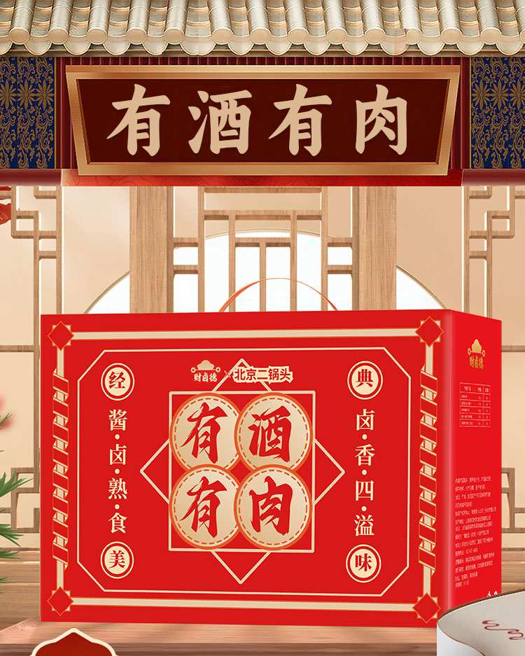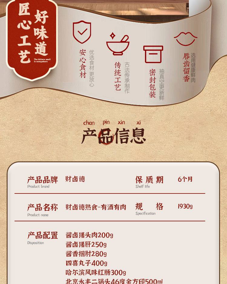 产品配置: 香酥带鱼300g1.酱卤猪头肉200g 2.酱卤猪肝250g 3.酱香捆肘280g 4.四喜丸子400g 5.哈尔滨风味红肠300g 6.北京永丰二锅头46度金方印500ml (中华老字号、纯粮固态发酵、国际金奖)