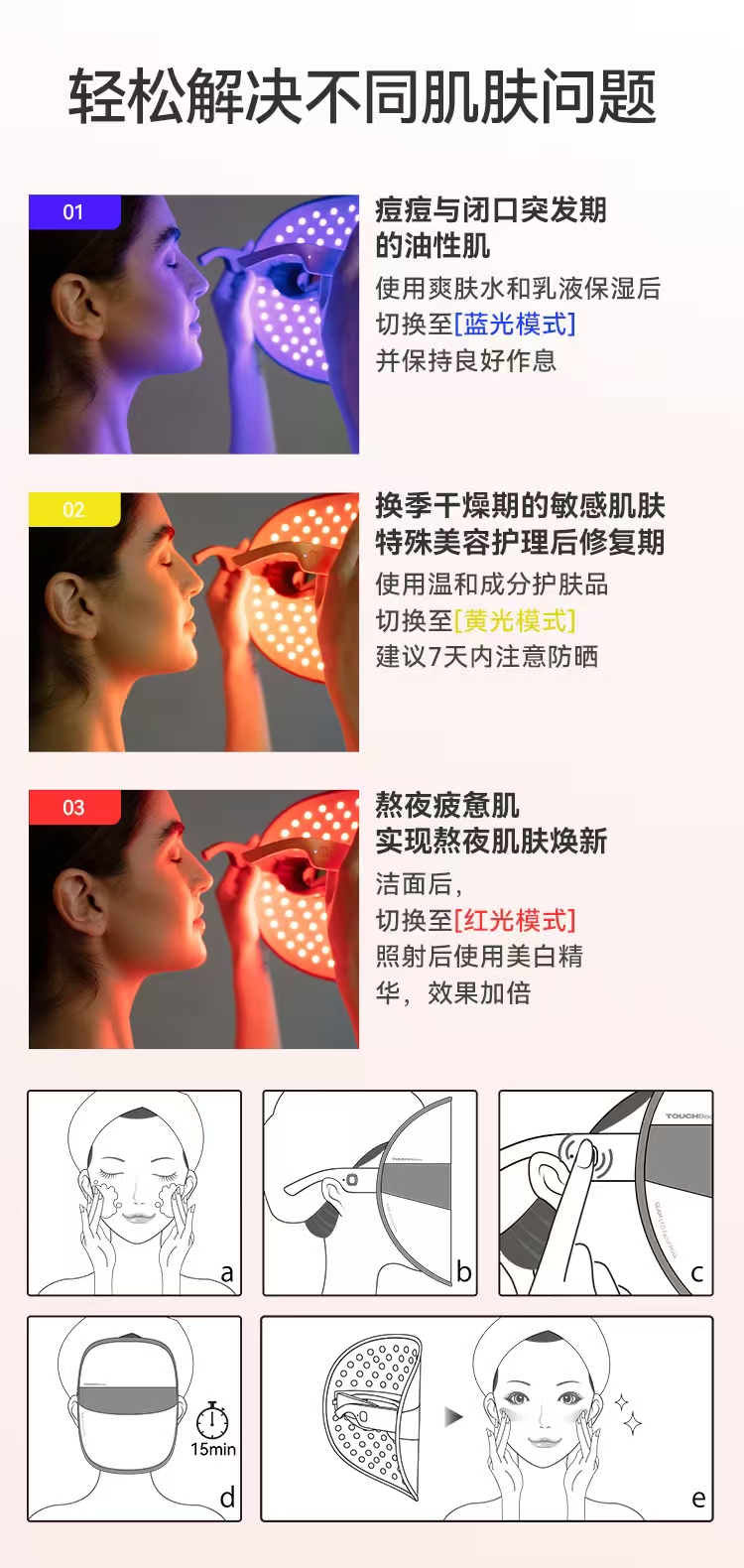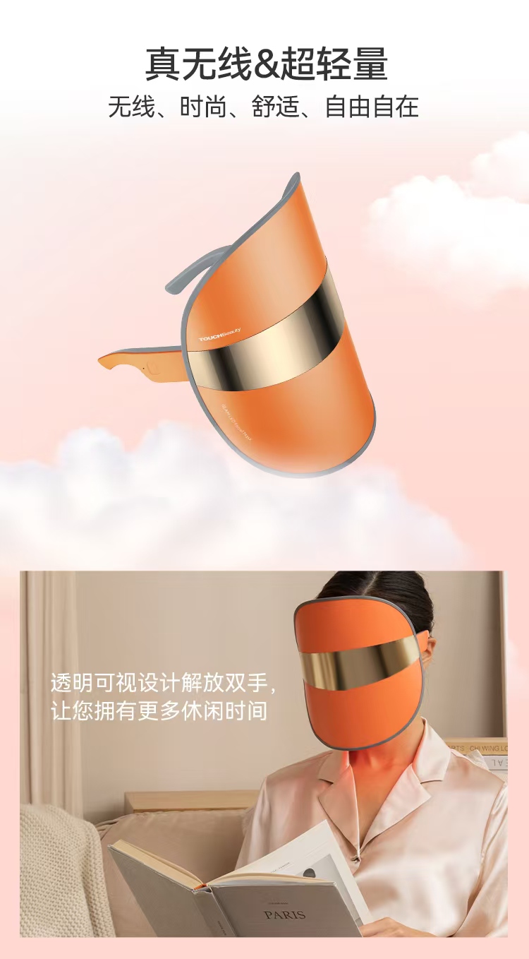 产品介绍: 94颗灯珠,密度分布为2厘米,针对痤疮爆发,提亮肤色,修复皮肤,解决不同的皮肤问题。三色光护理技术,眼镜式佩戴解放双手,动感应开关+模式记忆+自动定时功能,记得你的喜好和习惯,亲肤的硅胶保护眼睛,提升用户体验。