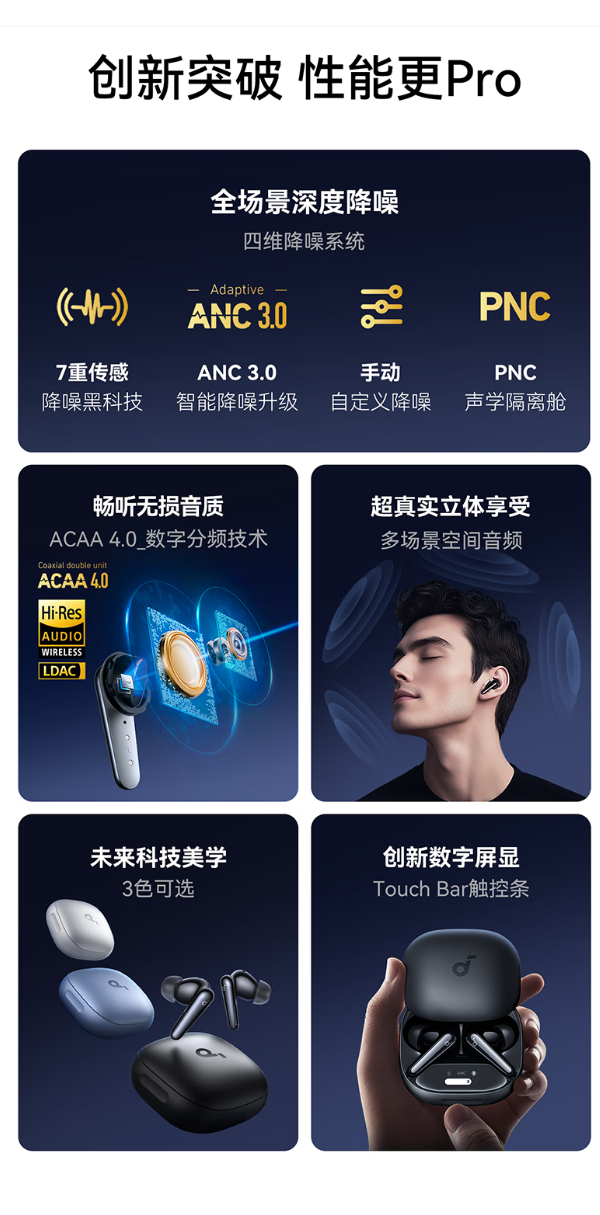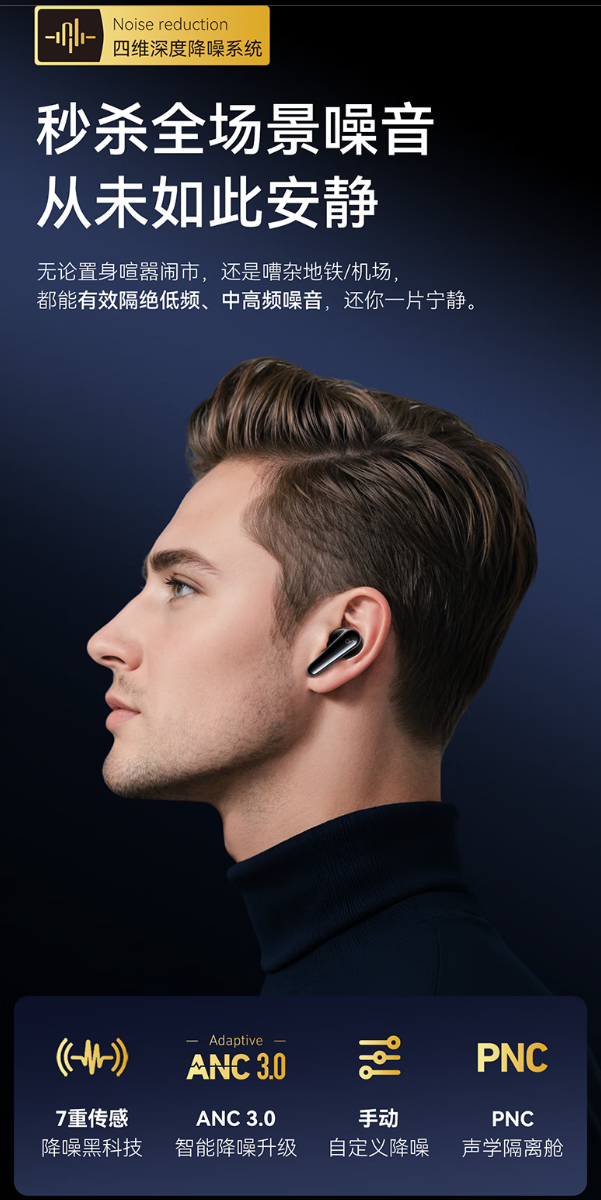 产品介绍: 7重传感器降噪黑科技,ANC 3.0 智能动态降噪,ACAA 4.0数字分频技术,还原高清音质,多场景空间音频,实时立体音效,充电舱滑动触控,智能数字显屏,40小时超长续航,快充5分钟畅听4小时。