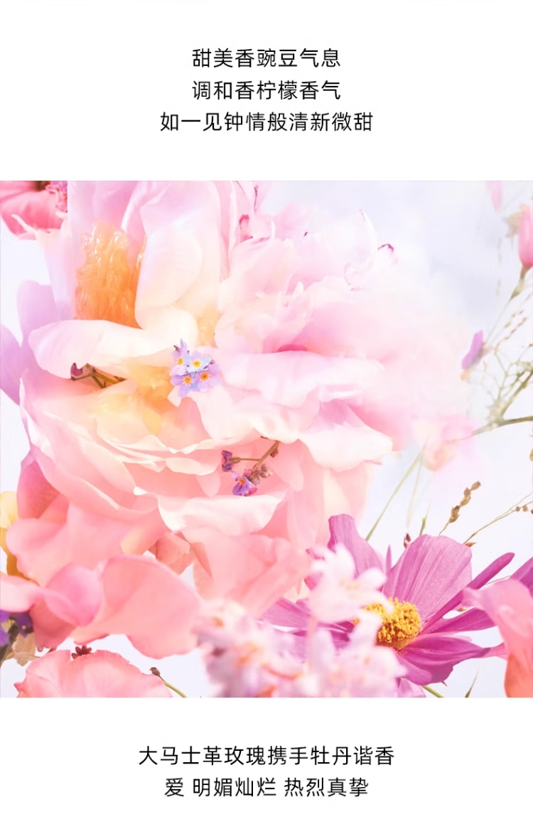 前调:有西西里柑橘、粉红葡萄柚等,散发清新果香,活泼轻快。中调:以大马士革玫瑰、牡丹花为主,呈现优雅浪漫的花香。 后调:有白麝香、广藿香等,香味变得温暖柔和,甜美而持久。