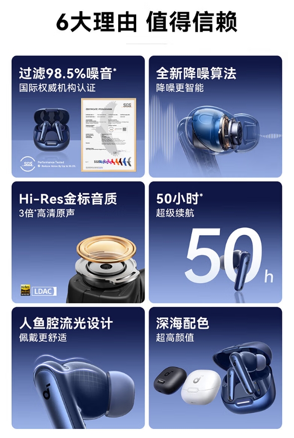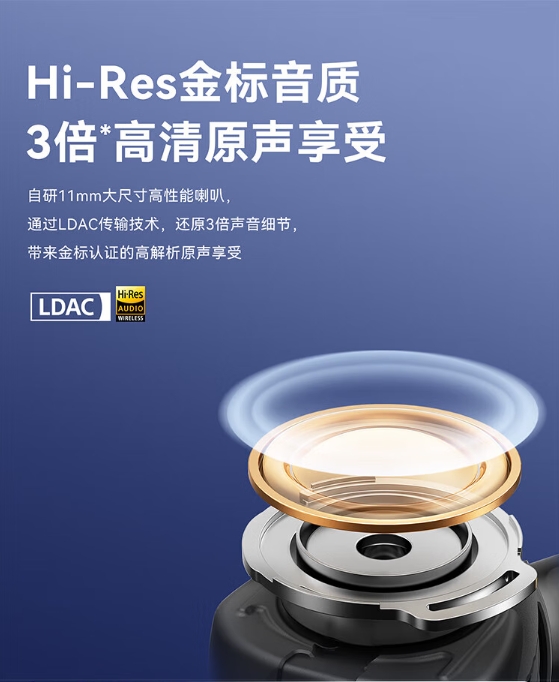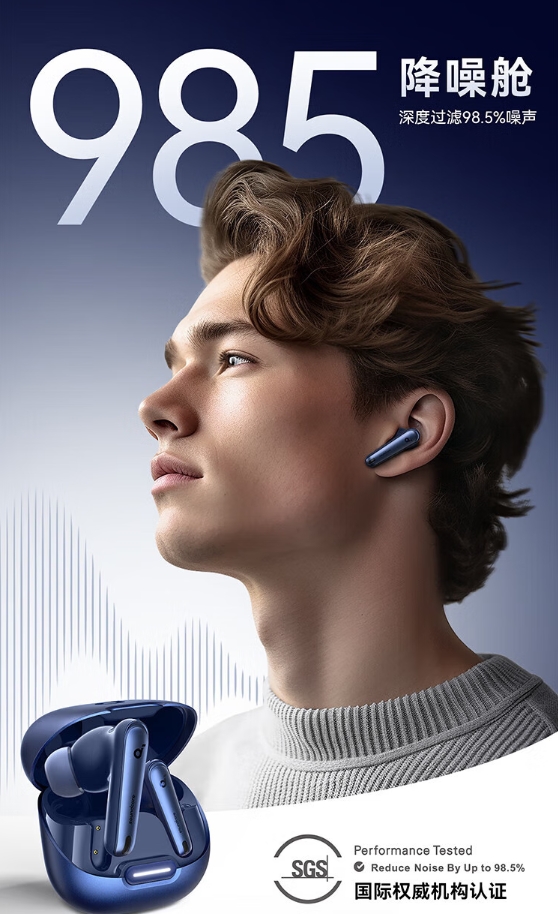 产品介绍: SGS国际权威机构认证,深度过滤98.5%噪音,智能降噪算法,全场景匹配,Hi-Res金标音质,3倍高清原声,50小时超长续航,人鱼腔流光设计,佩戴更舒适。