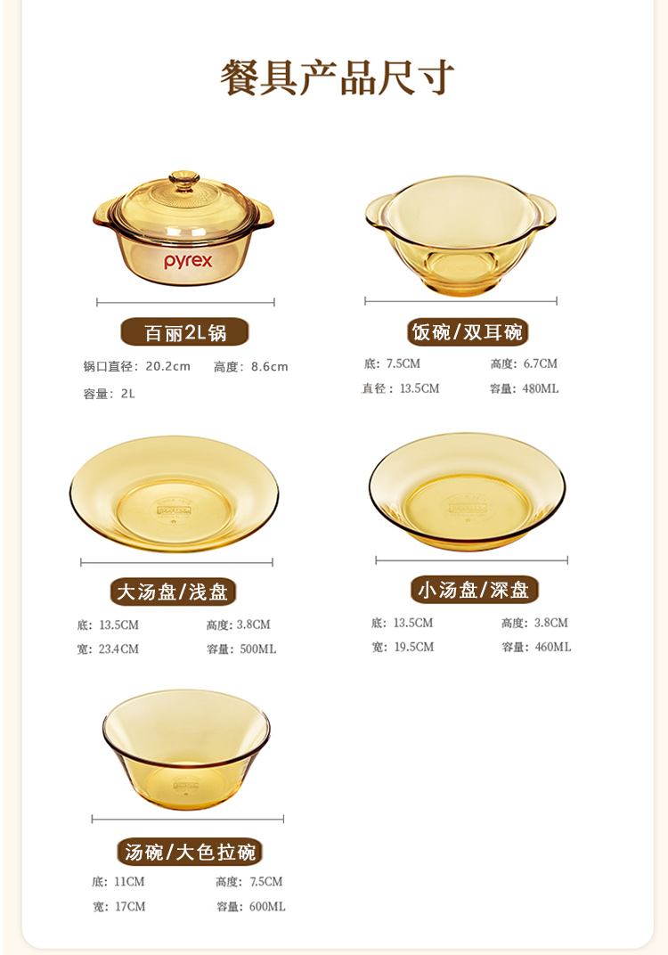 产品材质:玻璃陶瓷+高硼硅耐热玻璃 产品配置: 百丽透明锅2L×1 大汤盘×2 小汤盘×2 带耳碗×4 面碗×2