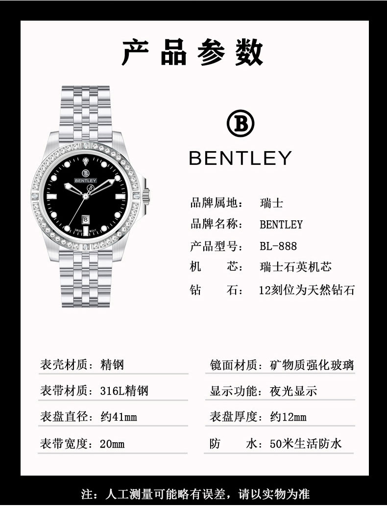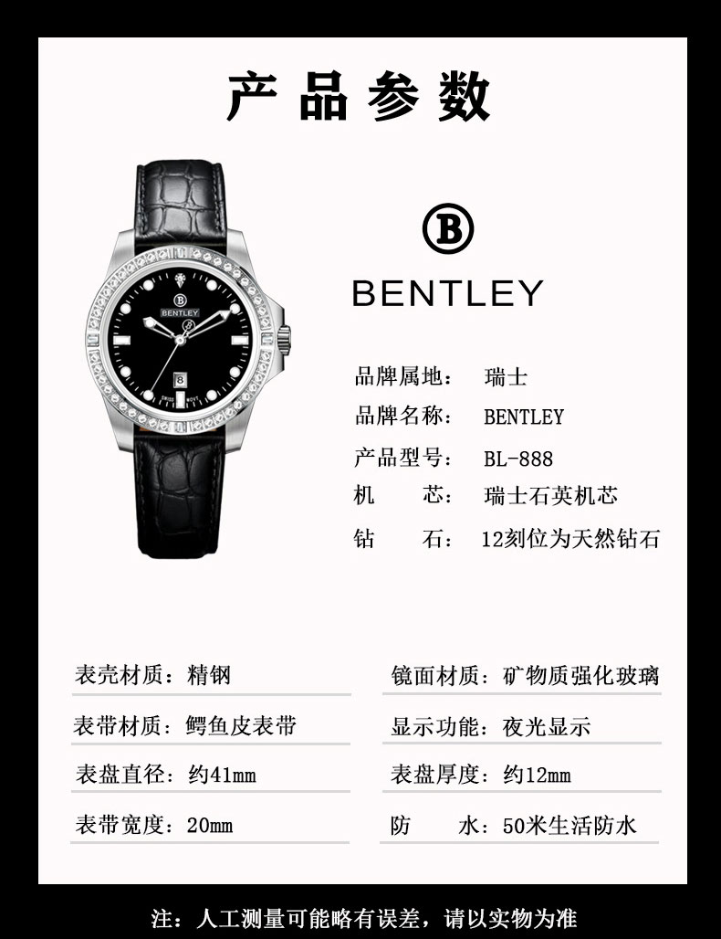 产品防水:50米生活防水 表盘直径:41mm 表盘厚度:12mm 表带宽度:20mm 产品颜色:鳄鱼皮带黑色、钢带黑色