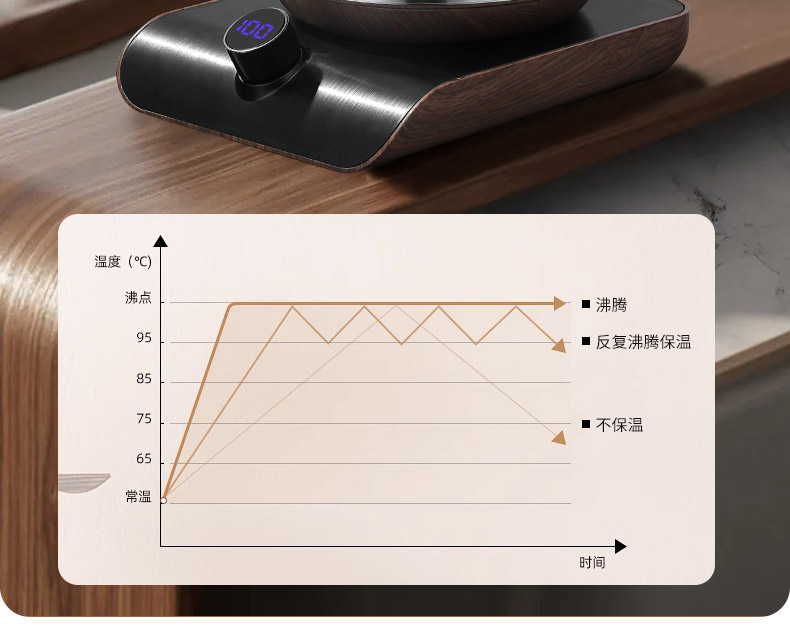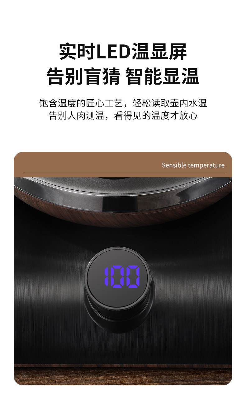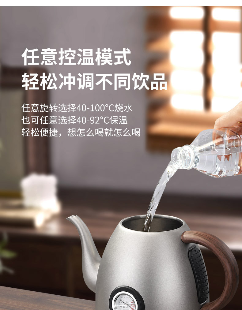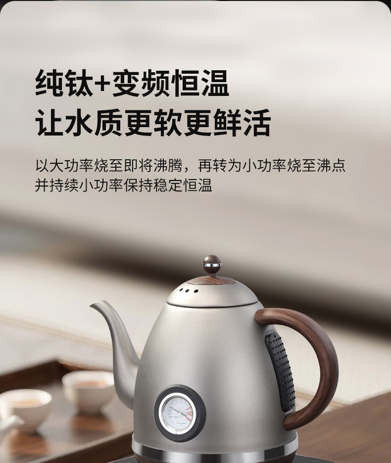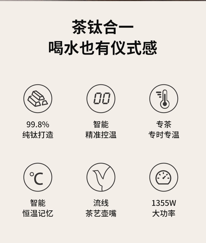 产品介绍: 99.84%纯钛打造、抗菌保鲜,智能控温、可选40-100℃烧水,智能恒温、低于设定温度5℃即刻加热,智能记忆常用温度、方便快捷,可视智能显温面板、精准匹配需求。