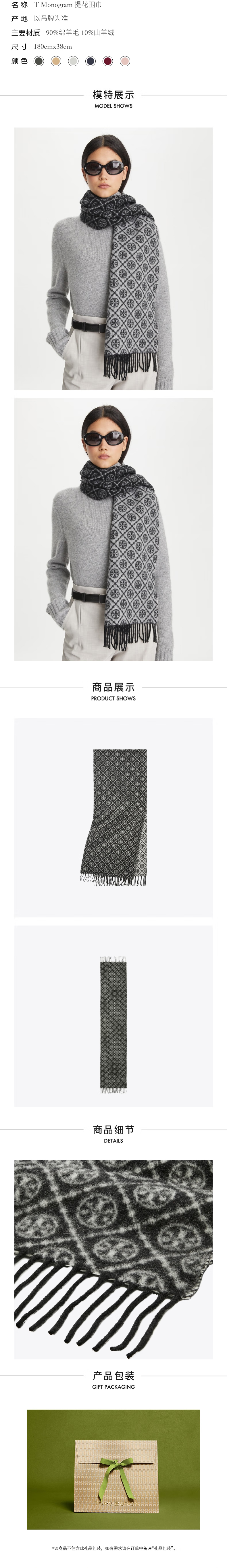 产品介绍: TORY BURCH 成立于 2004 年,以全球视野重塑美式奢华时尚我们的产品系列旨在激励女性,启迪未来世代。 产品材质:50%羊毛+50%棉 产品规格:180cm×35cm 产品颜色:黑灰色,咖色,红色