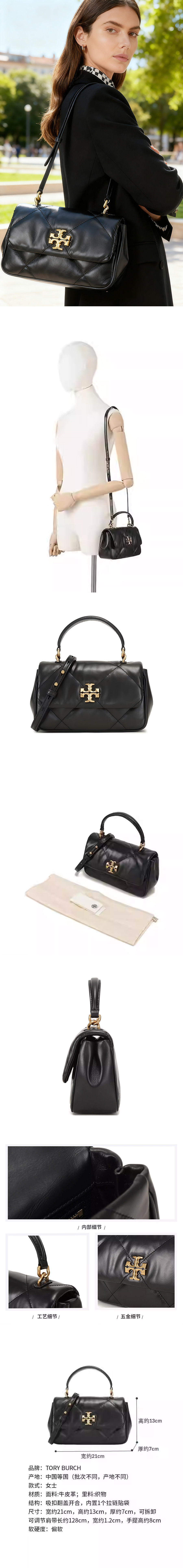 产品介绍: 汤丽柏琦(Tory Burch)是美国奢华时尚生活方式品牌,2004年2月创立于美国。产品涵盖鞋包、成衣及家居等品类,以双T徽标设计和Reva芭蕾舞平底鞋为标志, 产品尺寸:21×13×7cm 产品材质:牛皮革